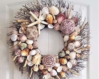 Add a seaside inspiration to your home or office with Seashell Branch Wreath. Dimensions Varies Upon Shaping. Whether you want to add a touch of the beach to your Christmas decor or just want a gorgeous shell accent throughout the year one of these seashell wreaths is bound to suit your needs.